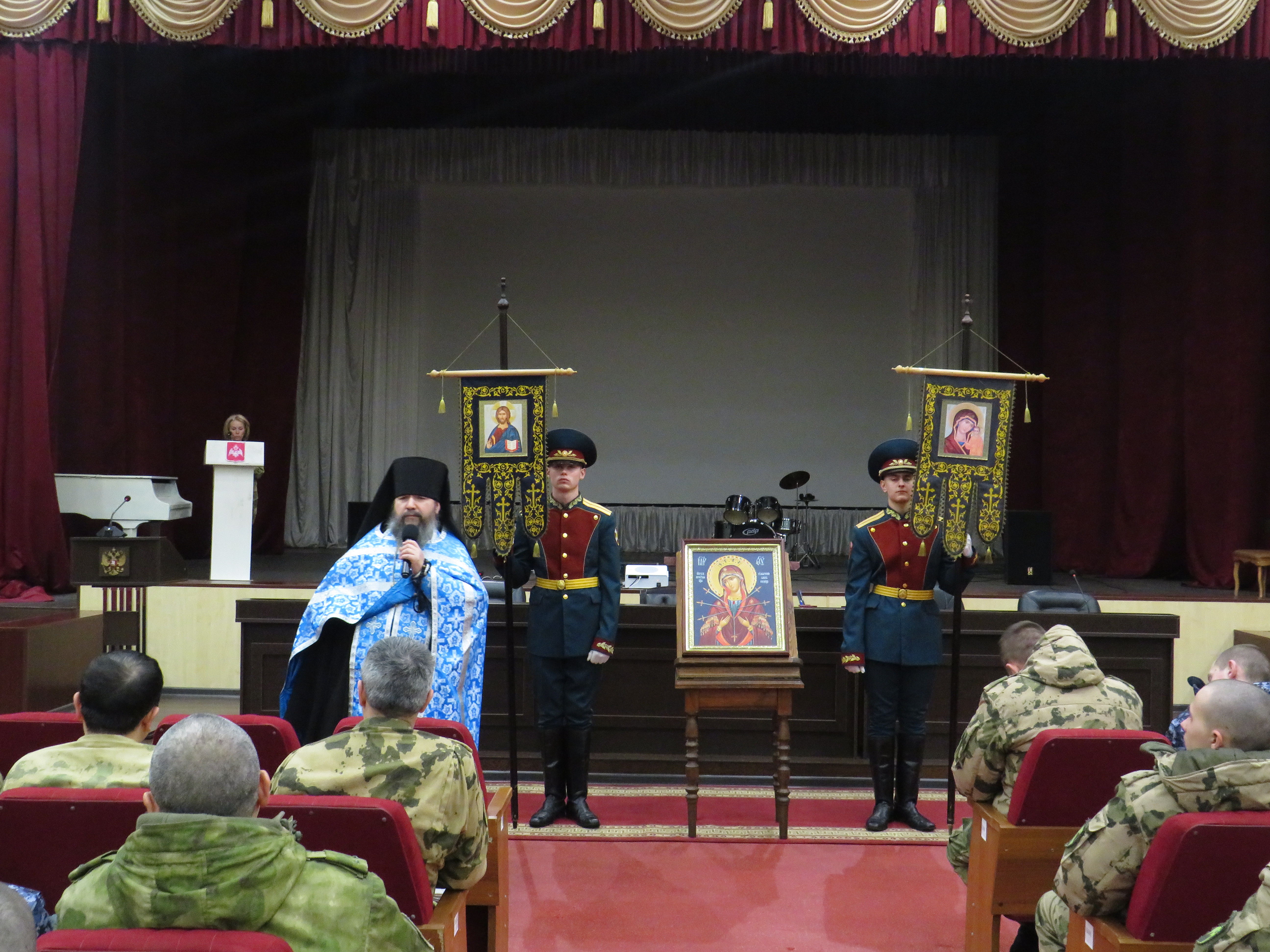 Каждый из выступающих отметил значимость веры в жизни человека и необходимость молитвенного обращения к Божией Матери воинов, выполняющих служебно-боевые задачи. Командир Бригады поблагодарил в лице директора Софринского завода Русскую Православную Церковь за заботу о воинах-софринцах и выразил надежду на дальнейшее тесное взаимодействие. Далее перед участниками выступил игумен Феофан, который рассказал о духовном значении иконы «Умягчение злых сердец», привёл реальные примеры помощи Царицы Небесной воинам, находящимся на военных действиях, и в сослужении с военными священнослужителями – иереем Георгием Парамоновым и иереем Евгением Ковалевым совершил молебен перед святыней, прибывшей в войсковую часть.
