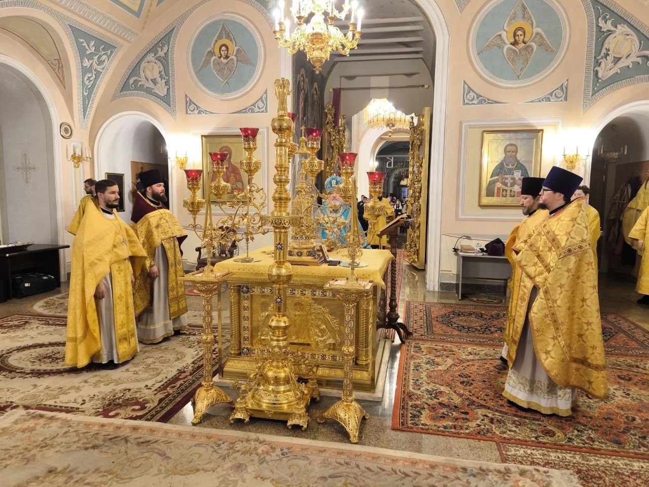 Богослужение возглавил почетный настоятель храма, председатель Синодального комитета по взаимодействию с казачеством, Синодального отдела по взаимодействию с Вооруженными Силами и правоохранительными органами митрополит Ставропольский и Невинномысский Кирилл. Архипастырю сослужили настоятель храма иерей Тимофей Чайкин, председатель Коллегии по окормлению казачества при Отделе по взаимодействию с Вооруженными силами правоохранительными органами и казачеством Сергиево-Посадской епархии протоиерей Александр Азаров, духовник молодежной казачьей организации Терского казачьего войска «Терцы» иерей Михаил Кузьменко и духовенство подворья.
