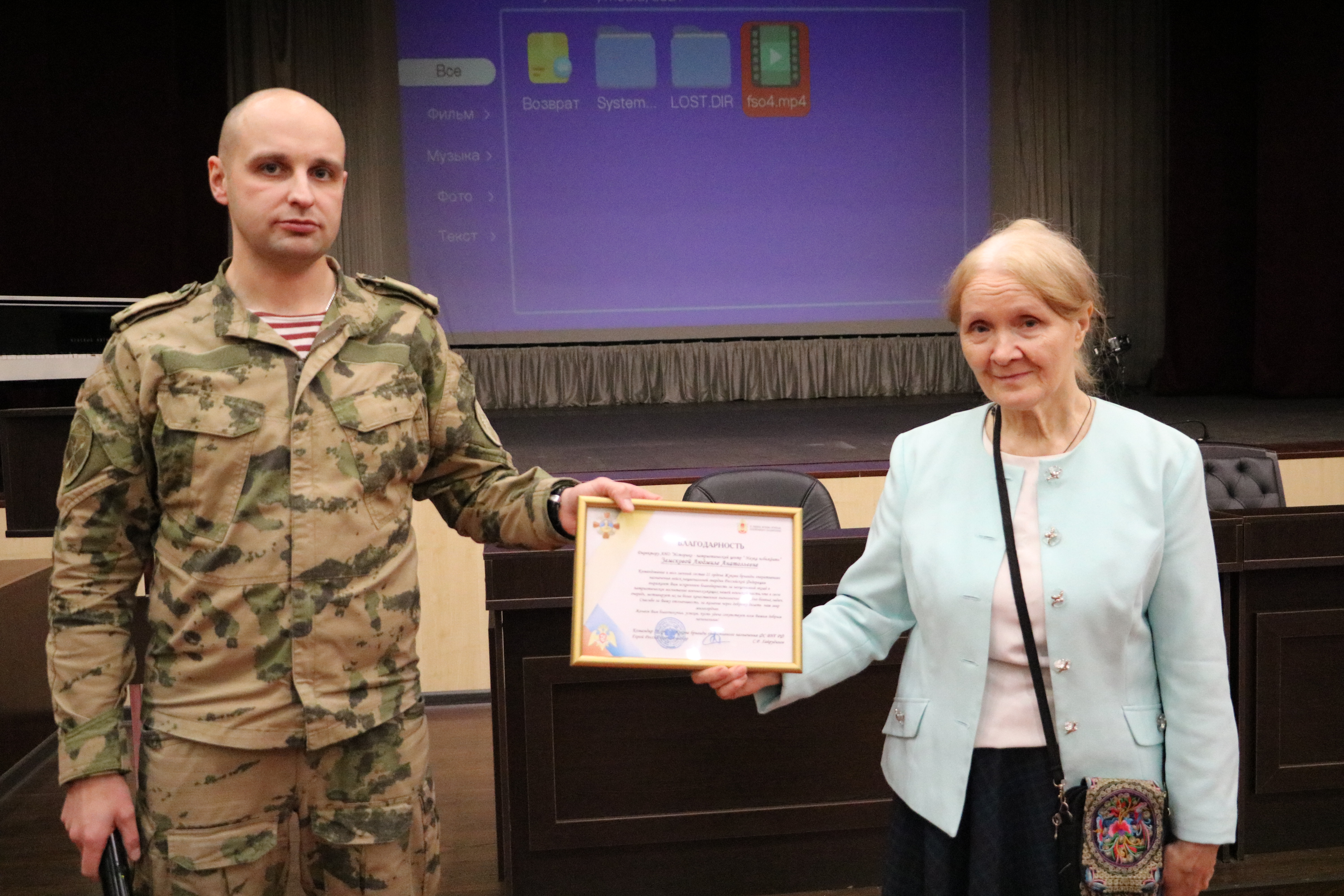 В завершении встречи игумен Феофан от лица командования и всего личного состава бригады преподнес Людмиле Анатольевне благодарственное письмо, а также вручил памятные подарки, связанные с боевым путем Софринской Бригады. После общей фотографии войсковой священник обсудил с гостьей планы дальнейшего посещения войсковых частей в различных благочиниях Сергиево-Посадской епархии.