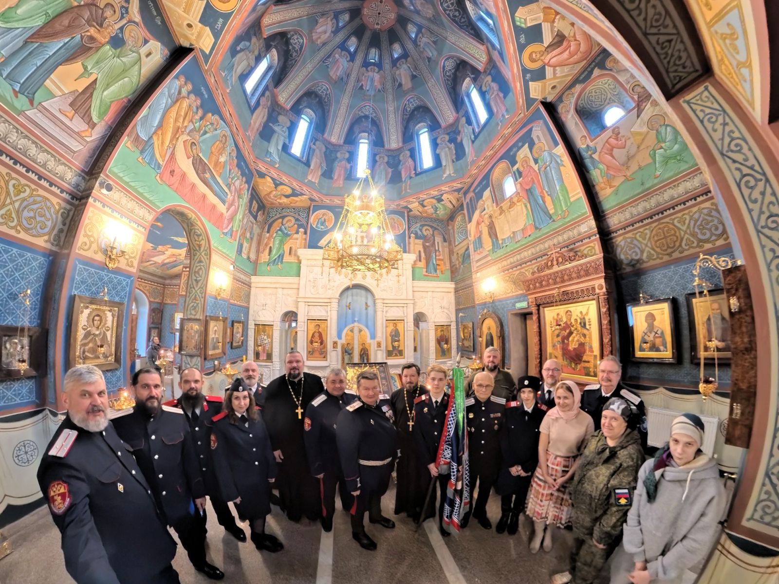 4 ноября в светлый день Казанской иконы Божией Матери в Покровском казачьем храме после праздничной службы прошел чин наречения именем священномученика Ермогена Патриарха Московского и всея Руси Чудотворца Городского казачьего общества г. о. Солнечногорск. Настоятель храма председатель Коллегии по окормлению казачества при Отделе по взаимодействию с Вооруженными силами правоохранительными органами и казачеством Сергиево-Посадской епархии протоиерей Александр Азаров с прихожанами и поздравил всех с этим знаменательным днем. Далее он совершил чин освящения ранее изготовленного знамени с ликом священномученика Ермогена, на древке которого была размещена памятная лента с указанием его титула и имени. Данное наречение ранее получило благословение и одобрение епископа Сергиево-Посадского и Дмитровского Кирилла. На мероприятии присутствовали: атаманы и заместители атаманов г. о. Солнечногорск, г. Зеленоград, Северо-Западного войскового общества г. Санкт-Петербург, участники СВО и члены их семей, представители казачьих обществ.